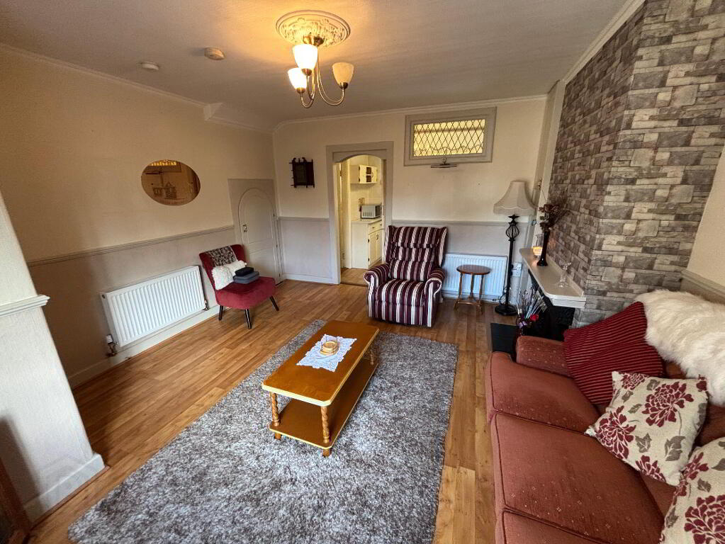 4.00m x 4.30m A spacious and comfortable living area with timber-effect laminate flooring. The room features an open fireplace, currently fitted with an electric insert, and includes access to a convenient under-stairs storage area. A large front-facing window ensures the room is filled with natural light.